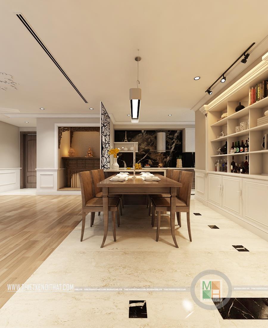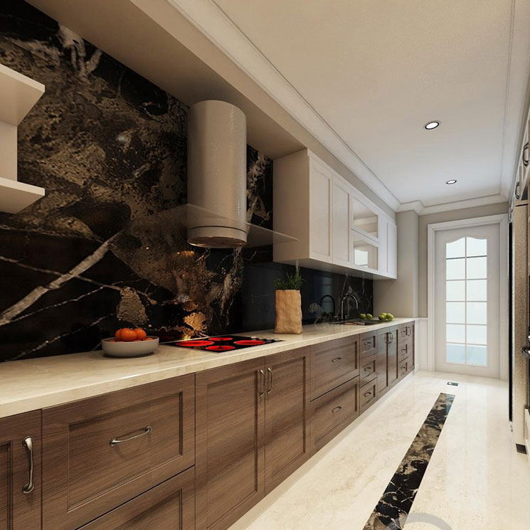 Với gam màu nâu trầm bạn chỉ cần sử dụng tủ bếp dưới chất liệu tủ bếp gỗ tự nhiên óc chó kết hợp cùng tủ bếp trên chất liệu acrylic gam màu trắng sẽ tạo nên sự đồng điệu hài hòa trong không gian bếp.