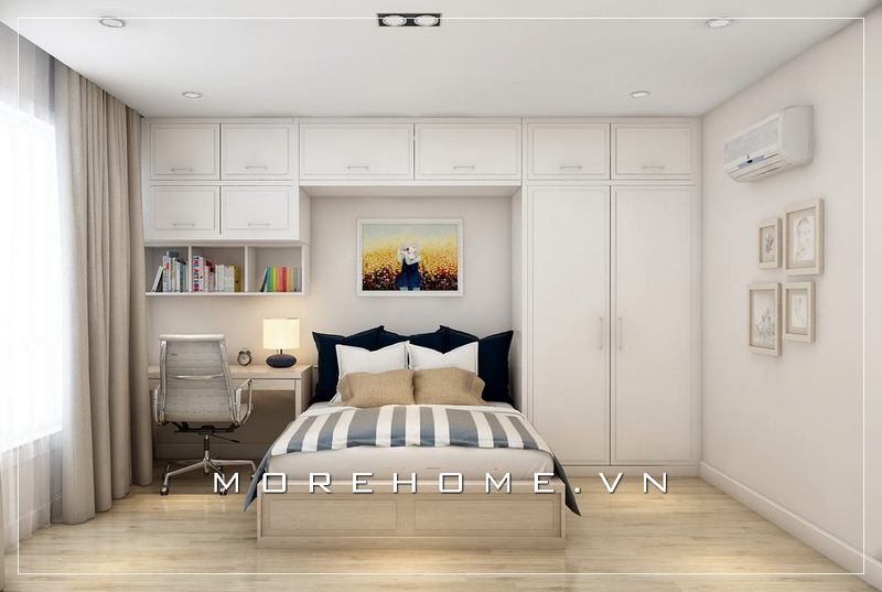 Tủ quần áo gỗ công nghiệp được thiết kế hiện đại, gam màu trắng tinh tế đồng nhất với không gian tạo sự liền mạch cho cả căn phòng