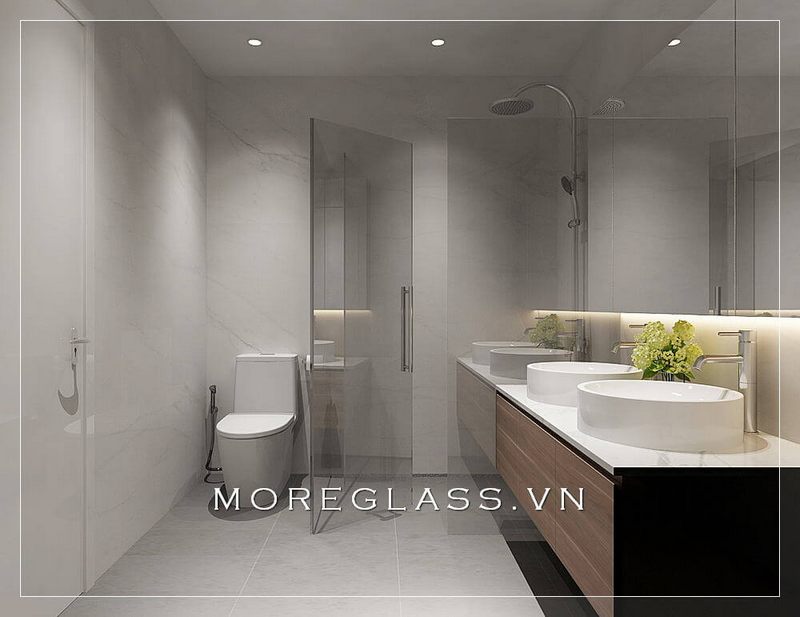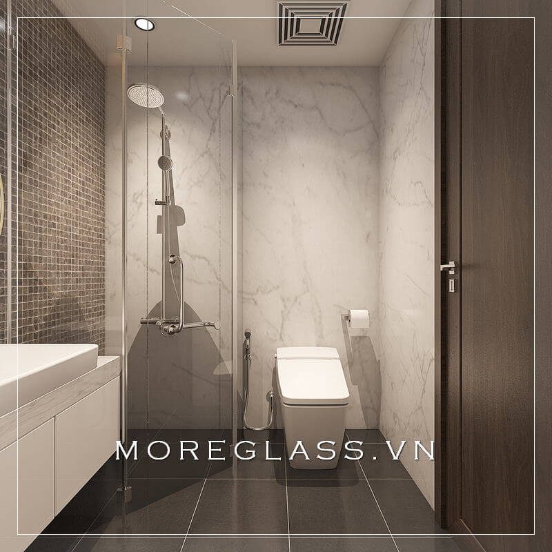 Sử dụng đá tự nhiên cao cấp, ốp nền và tường kết hợp với vách kính tắm cường lực, chúng tôi sẽ tạo ra một không gian hoàn hảo trong từng chi tiết cho mẫu thiết kế phòng tắm đẹp của bạn và phân cách hai không gian nhà vệ sinh và phòng tắm.