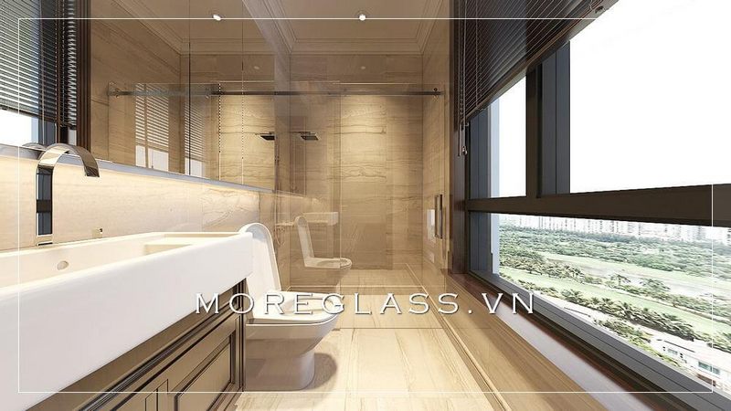 Mẫu thiết kế nhà vệ sinh và phòng tắm đẹp, ấn tượng với sự kết hợp giữa cửa sổ lớn và toàn không gian thành phố tạo nên một phong cách độc đáo trong thiết kế này.