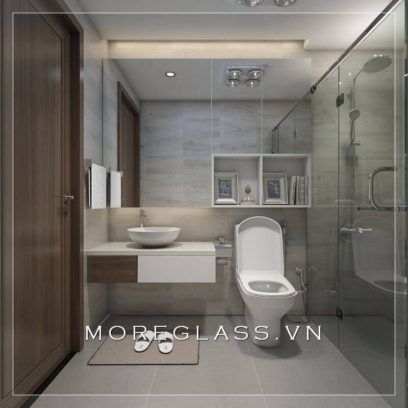 Nhà tắm hiện đại được thiết kế với kệ tủ trang trí, tủ lavobo gỗ công nghiệp nhỏ gọn và các thiết bị vệ sinh đơn giản tiện lợi.