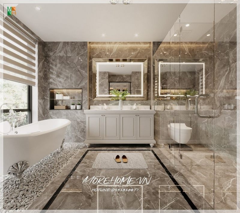 Phòng tắm master được trang bị bằng đá nhân tạo xám vân mây, được lồng ghép bởi ốp sàn và lát tường sang chảnh.